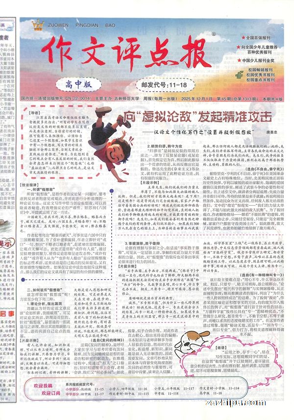 《作文评点报》创刊于1988年9月,由吉林省教育厅主管,吉林师范大学主办,作文评点报社编辑出版,全国公开发行(国内统一刊号:CN22—0014),面向全国中小学生及儿童的指导写作的专业性报纸。秉承“提高中小学生语文素养和写作水平”的办报宗旨,牢牢把握“作文”与“阅读”两大阵地,以极强的实用性和针对性,多角度、全方位地帮助学生提高作文应战能力。