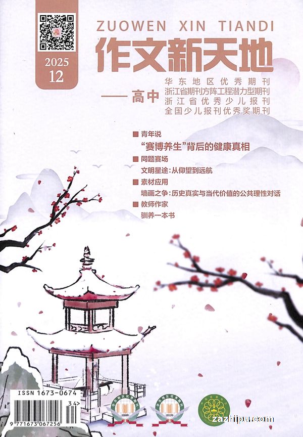 《作文新天地》(高中版)着眼于学生理性思辨能力的培养,引导学生关注社会现实、关注内心世界,加强思想的力度,拓展思维的深度,让学生在阅读同龄人的习作、作家的美文、名师的指导性文字中获得写作的技巧、智慧的启迪。